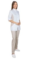Брюки прямого кроя с застежкой спереди на пуговицы, с поясом, стянутым резинкой. Брюки со съемными бретелями, с карманами в боковых швах, с задними накладными карманами, застегивающимися на пуговицу, с накладными карманами на боковых швах с клапаном, с усилительной накладкой в обрасти колен. По низу брюк пуфта с завязками.