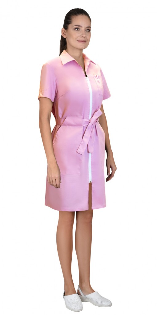 Описание: Халат женский полуприлегающего силуэта с центральной застежкой на молнию. Отложной воротник. Нагрудный накладной карман на левой полочке и два нижних накладных фигурных кармана. Рукава втачные короткие. Халат с завязывающимся поясом.