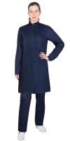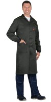 Описание: Халат мужской прямого силуэта, с центральной потайной застёжкой на пуговицы, с воротником стойка, с втачными рукавами с манжетой на пуговице, с нагрудными и нижними карманами, с разрезами в боковых швах, спереди и сзади элементы из ленты светоотражающей 50 мм для обеспечения сигнальной видимости. В халате предусмотрено крепление бейджа.