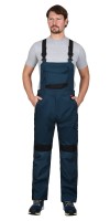 Сырье: Тк. Rodos 35%-х/б, 65%-п/э, поверхностная плотность 245г/м2Описание: Полукомбинезон с застёжкой гульфика и застёжкой в правом боковом шве на пуговицы, с различными карманами, с наколенниками, по спинке вставлена резинка.