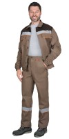 Сырье: Тк. смесовая 20% х/б, 80% п/э,поверхностная плотность 210 г/кв.м. ВООписание: Куртка короткая, с налакотниками, с центральной застежкой на пуговицы, с верхними и нижними накладными карманами, с притачным поясом застегивающийся на пуговицу. Брюки с наколенниками, с застежкой гульфика на пуговицы, с притачным поясом, застегивающимся на пуговицу, с наколенниками. На костюме распологается СОП 50 мм.