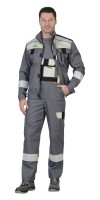 Описание: Костюм «СИРИУС-МАСТЕР» состоит из куртки и полукомбинезона.Куртка короткая, с отложным воротником с центральной потайной застежкой на четыре петли и пуговицы, застежкой притачного пояса на одну петлю и пуговицу частично стянутого резинкой; с нагрудными и нижними накладными карманами. Рукава втачные, с притачным манжетам, частично стянутым на эластичную тесьму. В куртке предусмотрена Лента светоотражающая шириной 50мм. для обозначения сигнальной видимости. Полукомбинезон прямого покроя, с застёжкой гульфика и застёжкой в правом боковом шве на три петли и пуговицы, с карманом и клапаном на нагруднике, с боковыми накладными карманами, с карманами для инструментов. По низу полукомбинезона предусмотрена Лента светоотражающая шириной 50мм. для обозначения сигнальной видимости