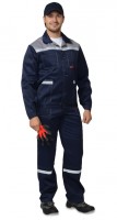 Полукомбинезон с застёжкой гульфика и застёжкой в правом боковом шве на три петли и пуговицы, верхним накладным карманом и нижними внутренними боковыми карманами, с наколенниками, с накладным карманом на левом боковом шве с клапаном на кнопке с патой, с двумя задними и карманами для инструментов, по спинке вставлена резинка