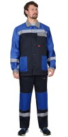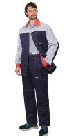 Описание: Куртка короткая с притачным поясом, центральной застежкой на пуговицы, с верхним накладным карманом с клапаном и нижними накладными карманами. Рукава двухшовные с манжетами на пуговицах, с отложным воротником. Полукомбинезон прямого покроя, с застёжкой гульфика и застёжкой в правом боковом шве на пуговицы, с накладными карманами. Бретели регулируются при помощи пряжек - фастексов и эластичной тесьмы. На куртке и брюках вставлена СО полоса 50 мм для обеспечения безопасной работы в условиях пониженной видимости.