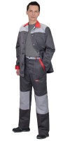 Описание: Костюм состоит из короткой куртки и полукомбинезона. Куртка прямого силуэта, короткая, с воротником стойка, с центральной застёжкой на тесьму-"молнию" накрытую ветрозащитным клапаном на липучках, с нижними прорезными карманами с листочкой, с притачным поясом регулирующимся по ширине при помощи хлястиков и липучки. Полукомбинезон с застёжкой гульфика и застёжкой в правом боковом шве на пуговицы, верхним накладным карманом и нижними внутренними боковыми карманами, с наколенниками, с накладным карманом на левом боковом шве с клапаном на липучке, с патой, с двумя задними и карманами для инструментов, по спинке вставлена резинка. В костюме размещены СО полосы 50 мм для обеспечения безопасности работы в условиях пониженной видимости.