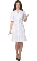 Описание: Халат женский, полуприлегающего силуэта, с центральной застежкой на рубашечные кнопки. Воротник стойка. Рукава втачные укороченные. Халат с верхним и нижними фигурными карманами, по спинке шлица. В рельефных швах халата отделочный кант сиреневого цвета.Цвет: