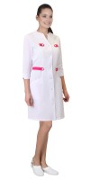Описание: Халат полуприлегающего силуэта с центральной застёжкой на пуговицы. Без воротника с фигурным вырезом горловины. Два кармана в рельефных швах. Рукава втачные длиной 3/4.