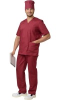 Описание: Блуза прямого покроя с V-образным вырезом горловины. На полочке один верхний и два нижних накладных кармана. Рукава короткие. Вырез горловины и манжеты рукавов из контрастной ткани. Брюки прямого покроя на резинке. Колпак одноцветный с отворотом.