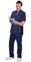 Блуза полуприлегающего силуэта, без застёжки, с овальным вырезом. Нижние горизонтальные карманы в швах с листочкой. Рукава втачные, короткие. По боковым швам разрезы. Брюки прямого силуэта, с застежкой гульфика на тесьму "молния", притачным поясом, застегивающимся на пуговицу, частично стянутым резинкой по боковым сторонам. Два боковых и два накладных задних кармана.