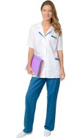 Описание: Костюм женский состоит из блузы и брюк. Блуза полуприлегающего силуэта с короткими рукавами, без застёжки. V – образный вырез горловины. С карманами в боковых швах. Спинка по линии низа длиннее полочки, по боковым швам разрезы. Горловина спинки, отложной манжет и внутренняя боковина карманов выполнены из контрастной ткани. Брюки прямые на притачном поясе без застежки. Два боковых кармана с бочками из контрастной ткани.
