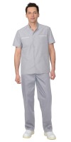 Описание: Блуза полуприлегающего силуэта, с центральной застёжкой на 6 петель и пуговиц, с воротником «стойка», Полочка с одним верхним и двумя нижними накладными карманами. Рукава втачные, короткие. Блуза отделана втачным кантом из контрастной ткани в цвет брюк. Брюки прямого силуэта, с заниженной талией, с застежкой гульфика на тесьму "молния", притачным поясом, застегивающимся на пуговицу, частично стянутым резинкой по боковым сторонам.