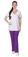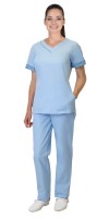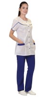Описание: Костюм женский комбинированный из ткани двух цветов состоит из блузы белого цвета и брюк синего цвета. Блуза полуприлегающего силуэта, без застёжки, с V – образным вырезом, с накладным карманом, с втачными короткими рукавами. Горловина, низ рукавов и верх кармана окантованы косой бейкой из ткани отделка. Блуза с завязывающимся сзади поясом. Брюки прямые с притачным поясом стянутым резинкой.