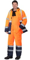Сырье:Ткань Смесовая ВО пропитка, 65% п/э, 35% х/б., поверхн. плотность 215 г/кв.м. .Описание: Куртка выполнена из основной и отделочной тканей. Куртка укороченная, прямого силуэта, с центральной бортовой застёжкой на тесьму «молния», накрытую ветрозащитным клапаном, застёгивающимся на потайную ленту «контакт», с воротником стойка, с верхними и нижними накладными карманами. Понизу куртка с притачным поясом, частично стянутым по бокам внутренней эластичной лентой. Рукава втачные, с манжетами.Брюки выполнены из основной ткани, прямые, на притачном поясе, застёгивающимся спереди на петлю и пуговицу. Брюки с застёжкой в среднем шве передних половинок - гульфик на молнии, с верхними боковыми накладными карманами и задним накладным карманом на правой половинке.