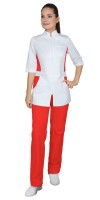 Брюки на талии стянуты эластичной тесьмой, по низу регулируются кнопками по ширине.