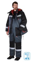 Брюки прямые с притачной утепленной подкладкой, с широким притачным поясом с фигурной линией верхнего края с застежкой на две обметание петли и пуговицы, в поясе предусмотрен ремень из помочной резинки который регулируется за счет защелки - фастекс, с застежкой гульфика на тесьму - "молния", с 5 узкими шлевками, с накладными боковыми карманами, с задним накладным карманом, накладным карманом с клапаном на правом боковым шве и отрезной нижней частью задних половинок. В брюках предусмотрены элементы из СОП шириной 25мм, и СВ кант для обеспечения сигнальной видимости в условиях пониженной видимости.