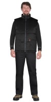 Жилет стёганный, на подкладке, прямой с углубленными проймами, с центральной бортовой застёжкой на тесьму - "молния", воротником - "стойка", верхним прорезным карманом на "молнии" и нижними утеплёнными стёганными накладными карманами. Пояс притачной, с эластичной лентой.